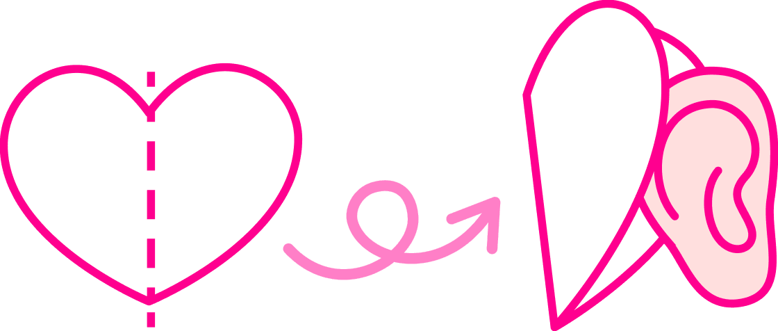 ハートパッドを半分に折るようにして耳をはさみます。(1枚で両耳にご使用いただけます)